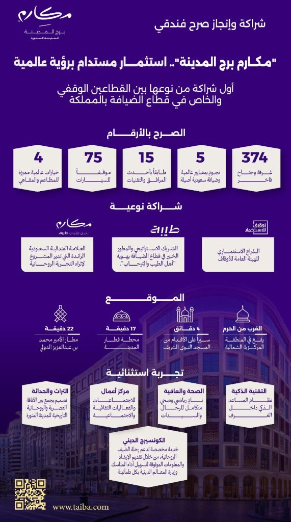 يمثل فندق وأجنحة “مكارم برج المدينة” تتويجًا للشراكة الاستراتيجية بين شركة “أوقاف للاستثمار” وشركة “طيبة”، التي تم بموجبها إنشاء شركة ذات غرض خاص لتطوير وتشغيل فندق خمس نجوم في المنطقة المركزية تحت العلامة الفندقية السعودية “مكارم”، مستندةً إلى تكامل الأدوار بين الطرفين، حيث توفر أوقاف للاستثمار الأصول الوقفية والإطار الاستثماري المستدام، فيما تسهم شركة طيبة بخبرتها الرائدة والعميقة في تطوير وتشغيل المشاريع الفندقية وخدمة ضيوف وزوار المدينتين المقدستين.